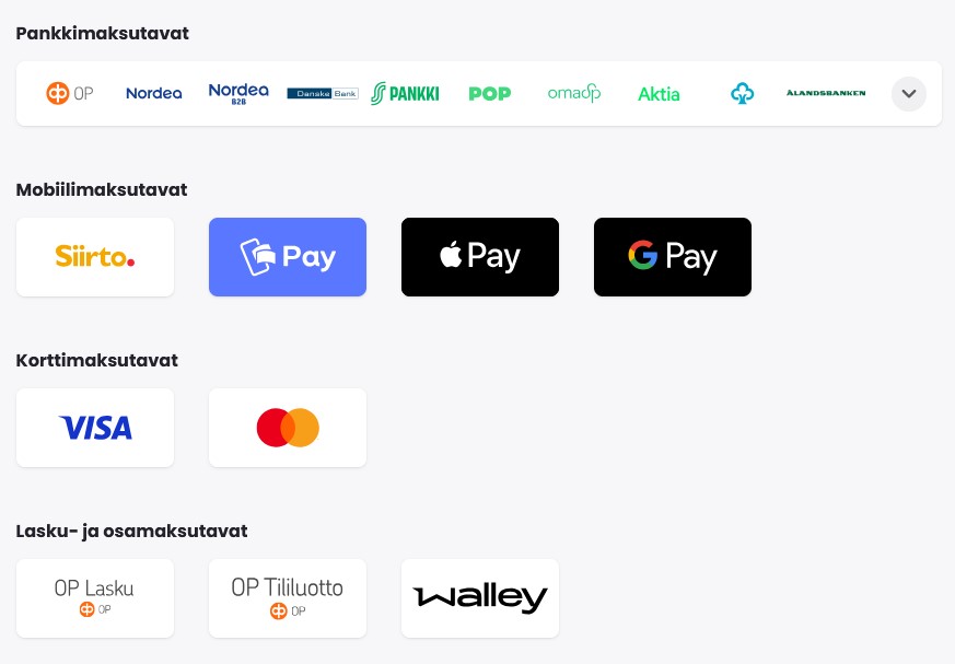 Käteinen, Debit-kortit, Visa, Eurocard, Mastercard, Amex. Laskutusmyynti vain erillissopimuksella.