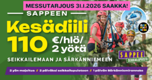 Majoitustarjoukset Kolme yötä kahden hinnalla Tarjoamme edullisimman yön! Sappeen Talvidiili Lue lisää ja varaa MESSUTARJOUS: Sappeen Kesädiili 2026 Tutustu ja varaa nyt!