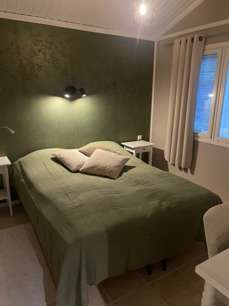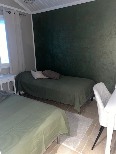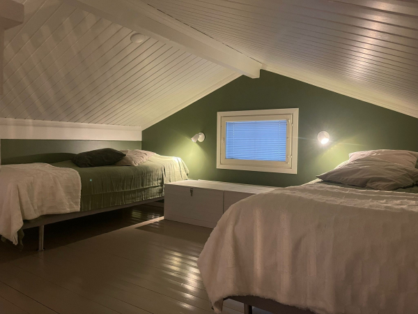 Tupakeittiö, 2 makuuhuonetta (2 sänkyä toisessa, toisessa parisänky), parvella 2 sänkyä, lisäksi kaksi patjaa.
