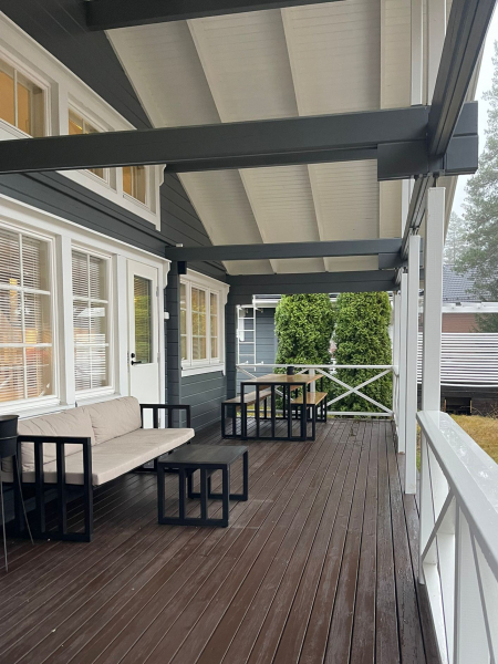 Katettu terassi. Kaasugrilli terassilla ja hiiligrilli, jota säilytetään varastossa.